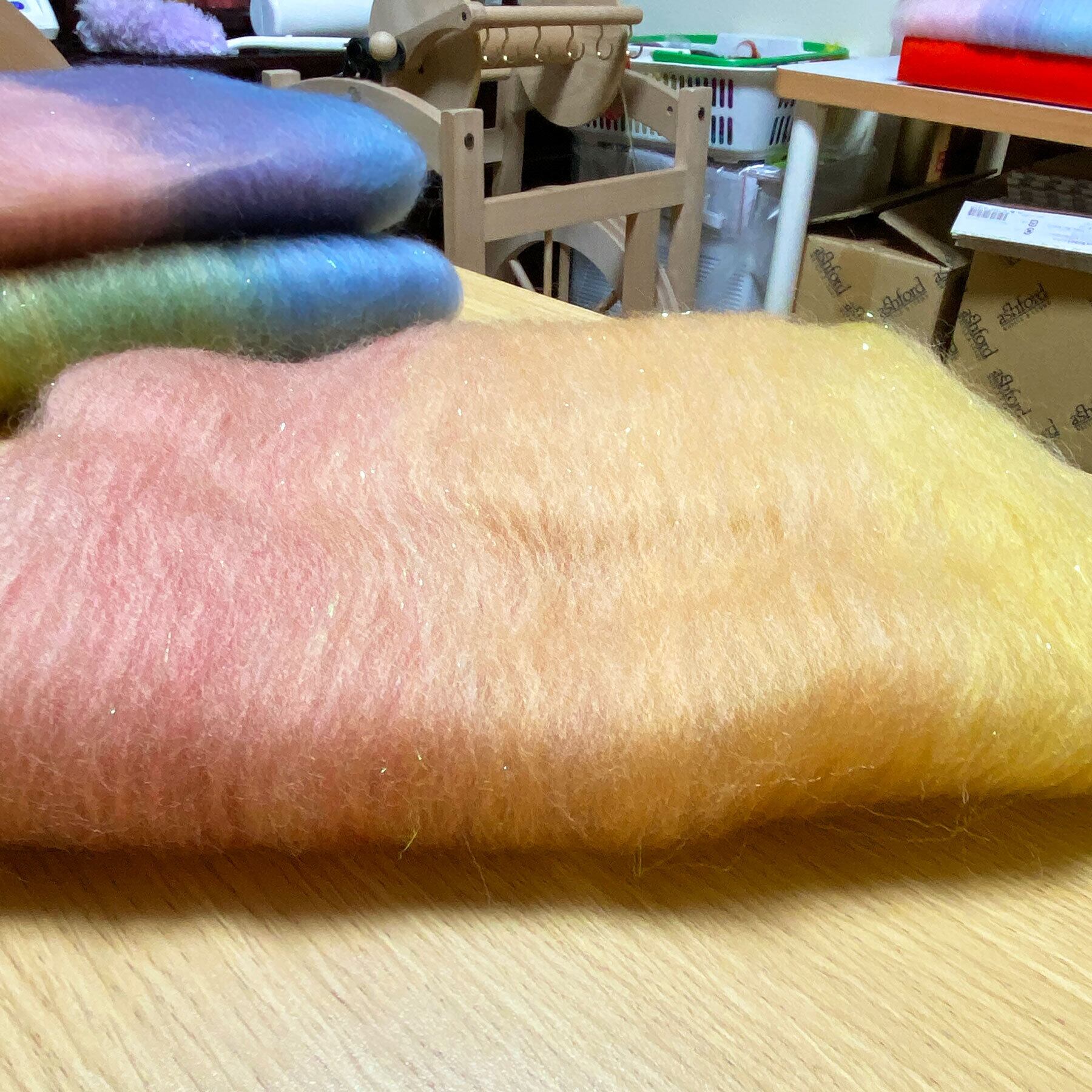 オリジナルに色調合した羊毛を使用し、丁寧にブレンドされた手紡ぎのための 少し渋めの色合いの大人の虹色バッツセットを販売(通販)しています